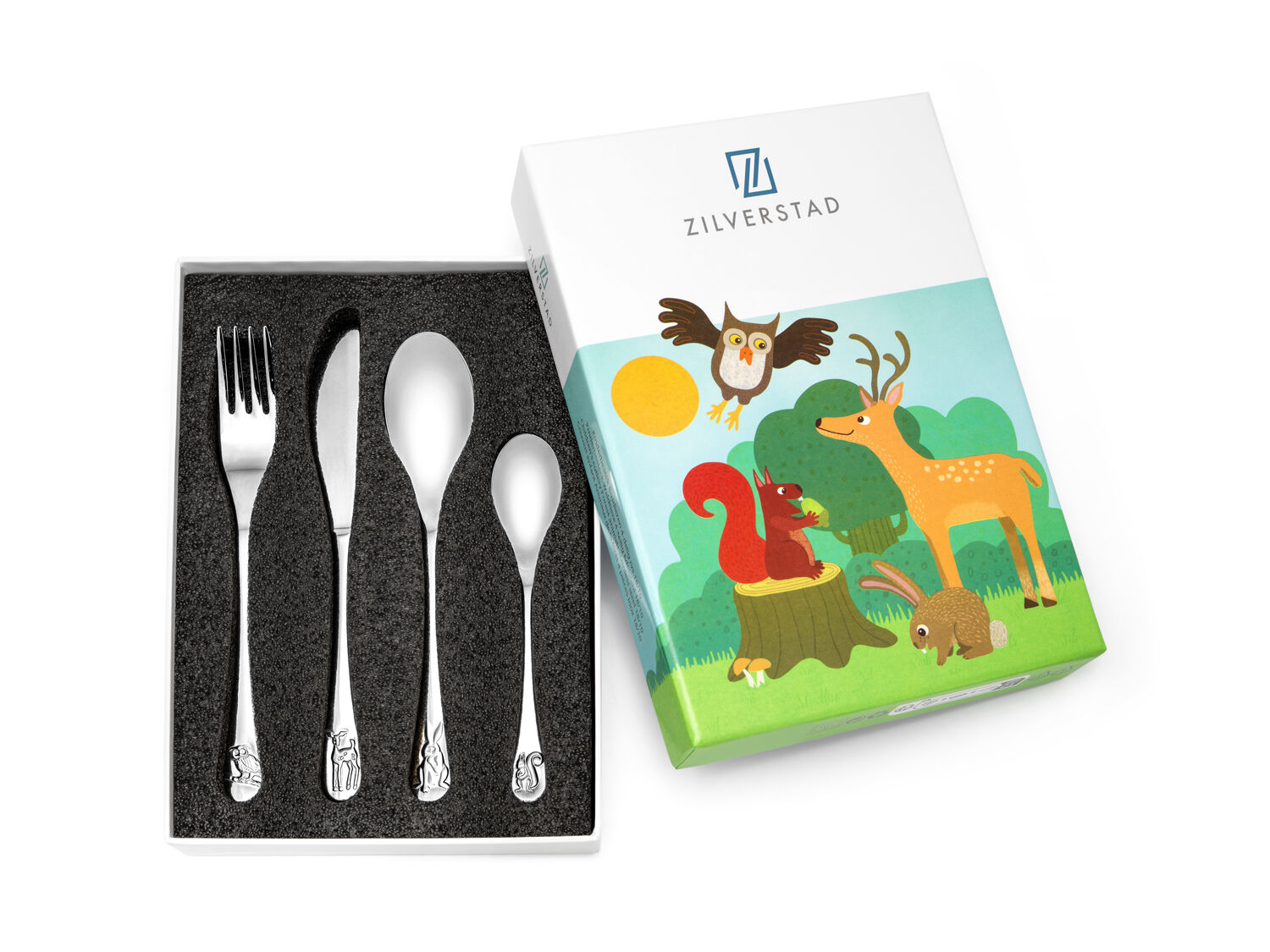 Deze lieve bosdieren maken eten nog leuker voor dierenliefhebbers. Op het bestek staan een hert, eekhoorn, haas en een uil afgebeeld. Verpakt in een mooie geschenkverpakking. Het bestek kan in de vaatwasser en de bestekonderdelen kunnen worden gegraveerd.