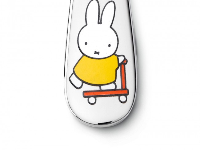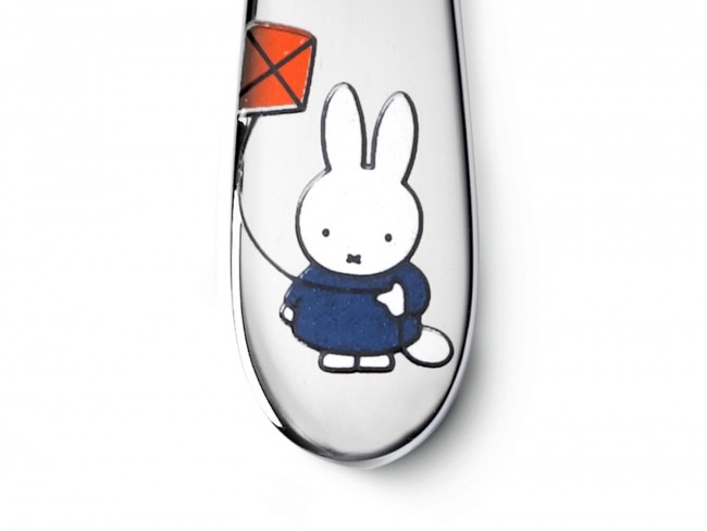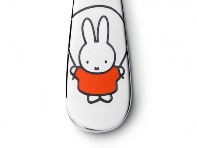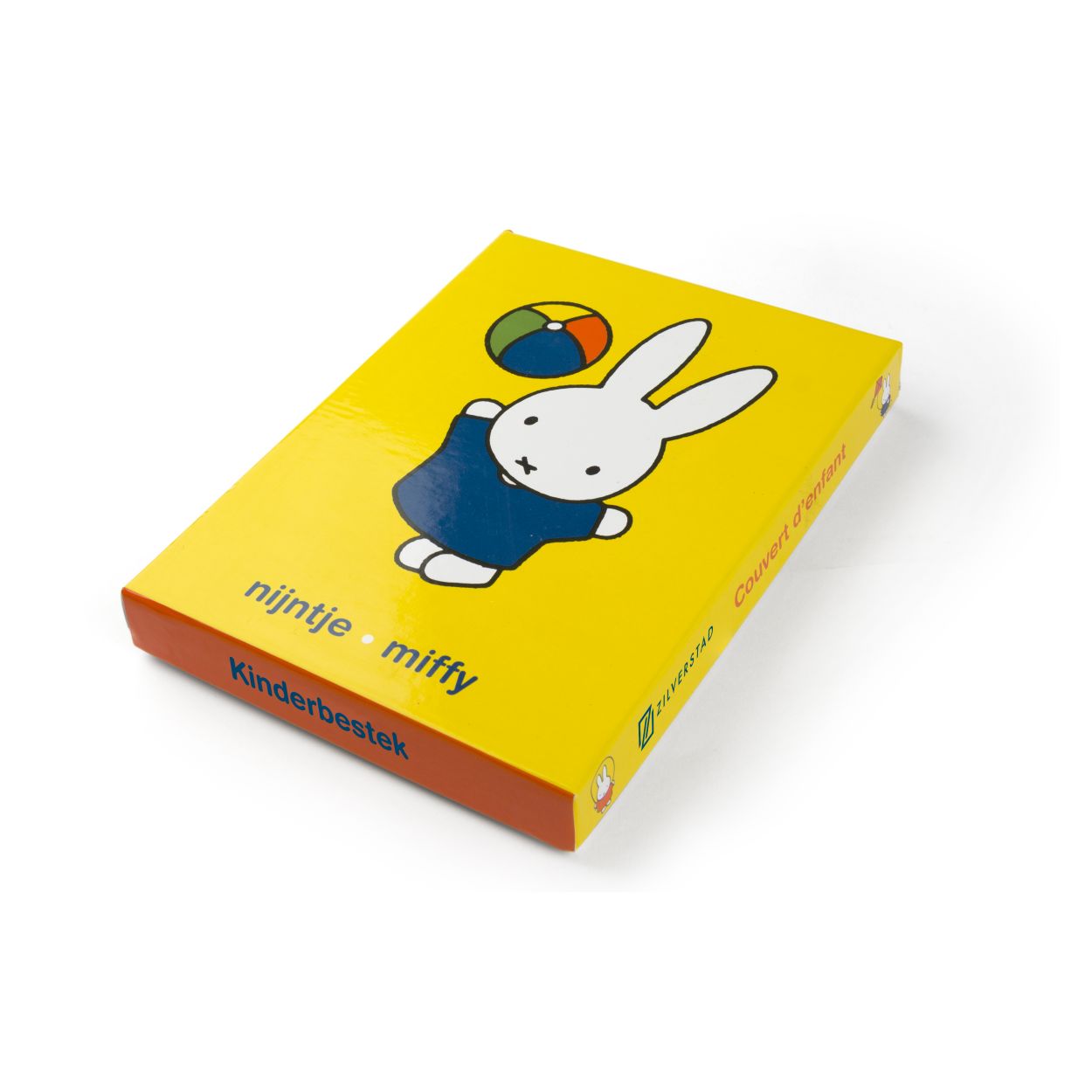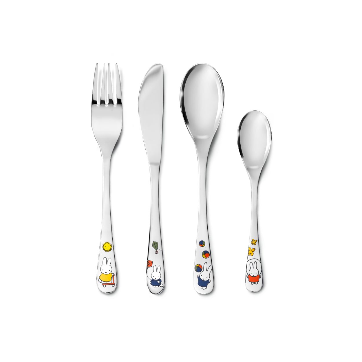 Op deze 4-delige bestekset staat een spelende nijntje in kleur afgebeeld. Omdat het bestek is vervaardigd uit edelstaal kan het in de vaatwasser. De bestekonderdelen kunnen worden gegraveerd. Leuk als geboorte-, doop- of verjaardagscadeau. Afmeting: vork: 16 cm, mes: 17 cm, eetlepel: 16 cm, dessertlepel: 13 cm.
